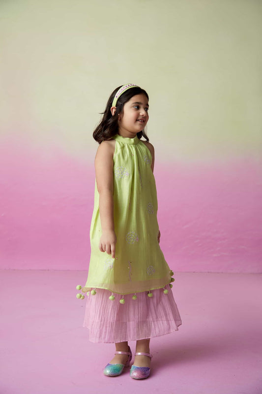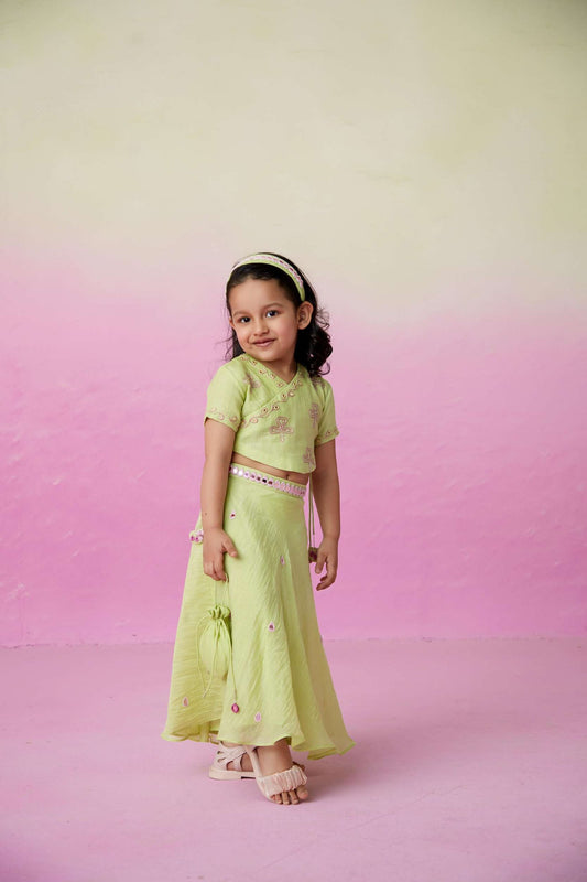 GIRL GULABO FLORAL EMBROIDERED SKIRT SET-MEHANDI GREEN