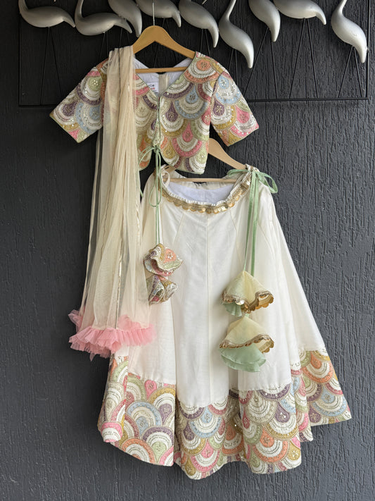 OFF WHITE SCALLOP EMB BLOUSE LEHNGA SET