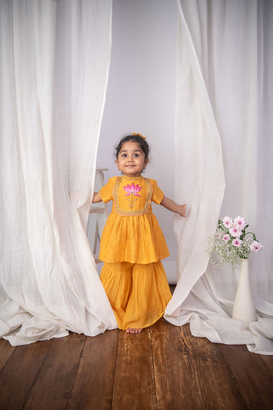 Girls can shine in elegant lehenga cholis, anarkali sets, and cape dresses that are crafted with detailed embroidery, frills, and vibrant colors. These designs bring out their cheerful personalities while offering comfort.