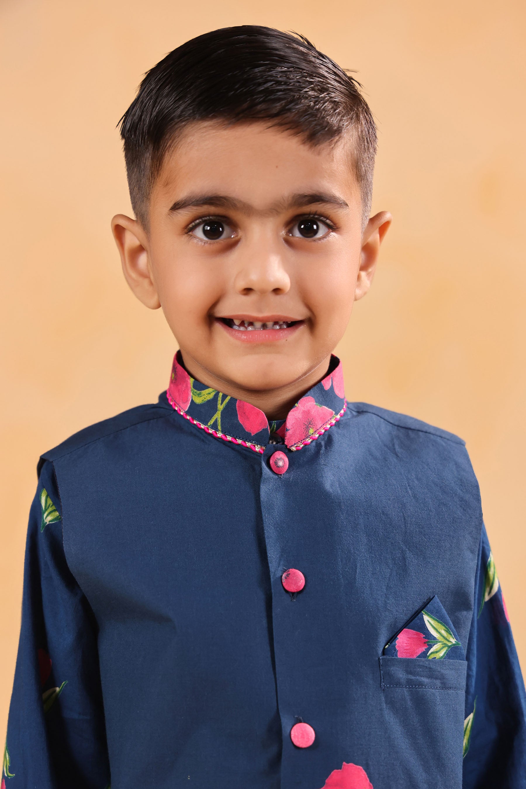 dress your boy in smart 3 pc set.its perfect for all day occassions and will be the most favourite in your kids wardrobe. 3pc set : 1kurta , 1 jacket , 1 churidar 100% cotton churidar with elasticated waist for best fit and kurta has front top buttons with printed jacket.