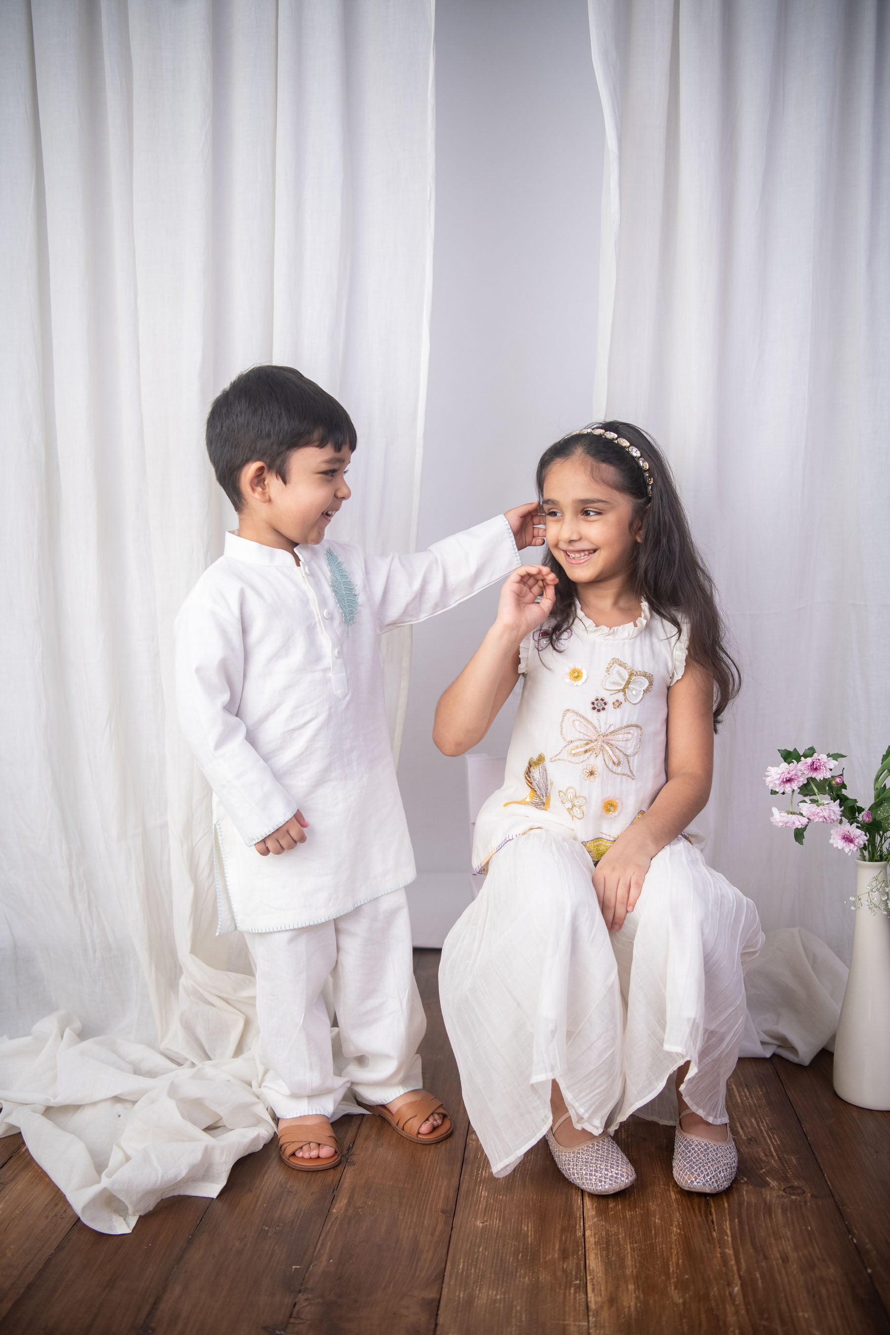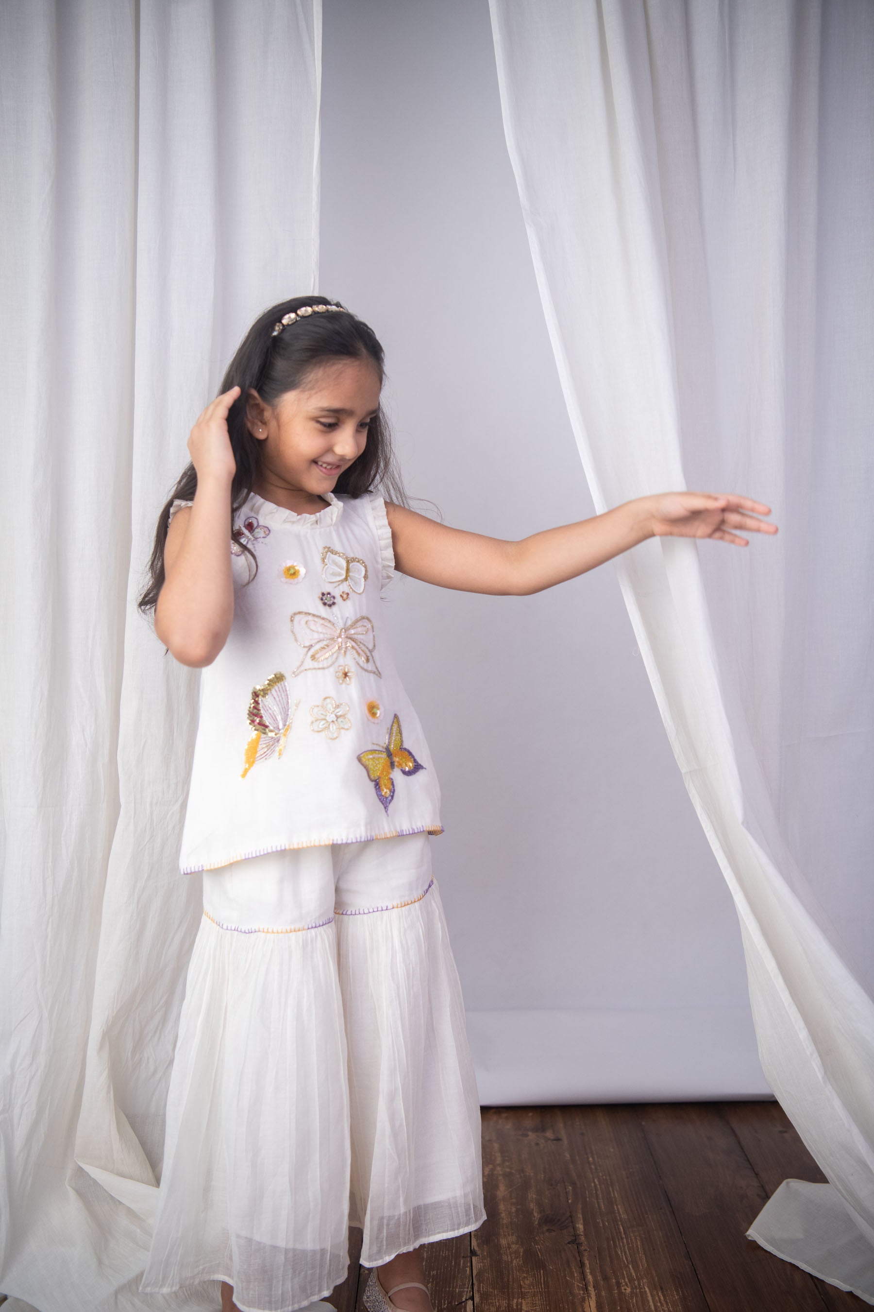 delicate, dreamy, and full of charm — this 2-piece white top and sharara set is crafted from soft chanderi fabric, offering a breezy and elegant silhouette for your little one. the sleeveless top is beautifully hand-embroidered with vibrant butterflies and floral motifs in a mix of pastel and metallic threads, creating a magical garden-inspired look. the playful ruffle sleeves and colourful hem detailing add extra whimsy, while the flared sharara pants complete the look with flowy grace. perfect for festive occasions or a twirl-worthy celebration!