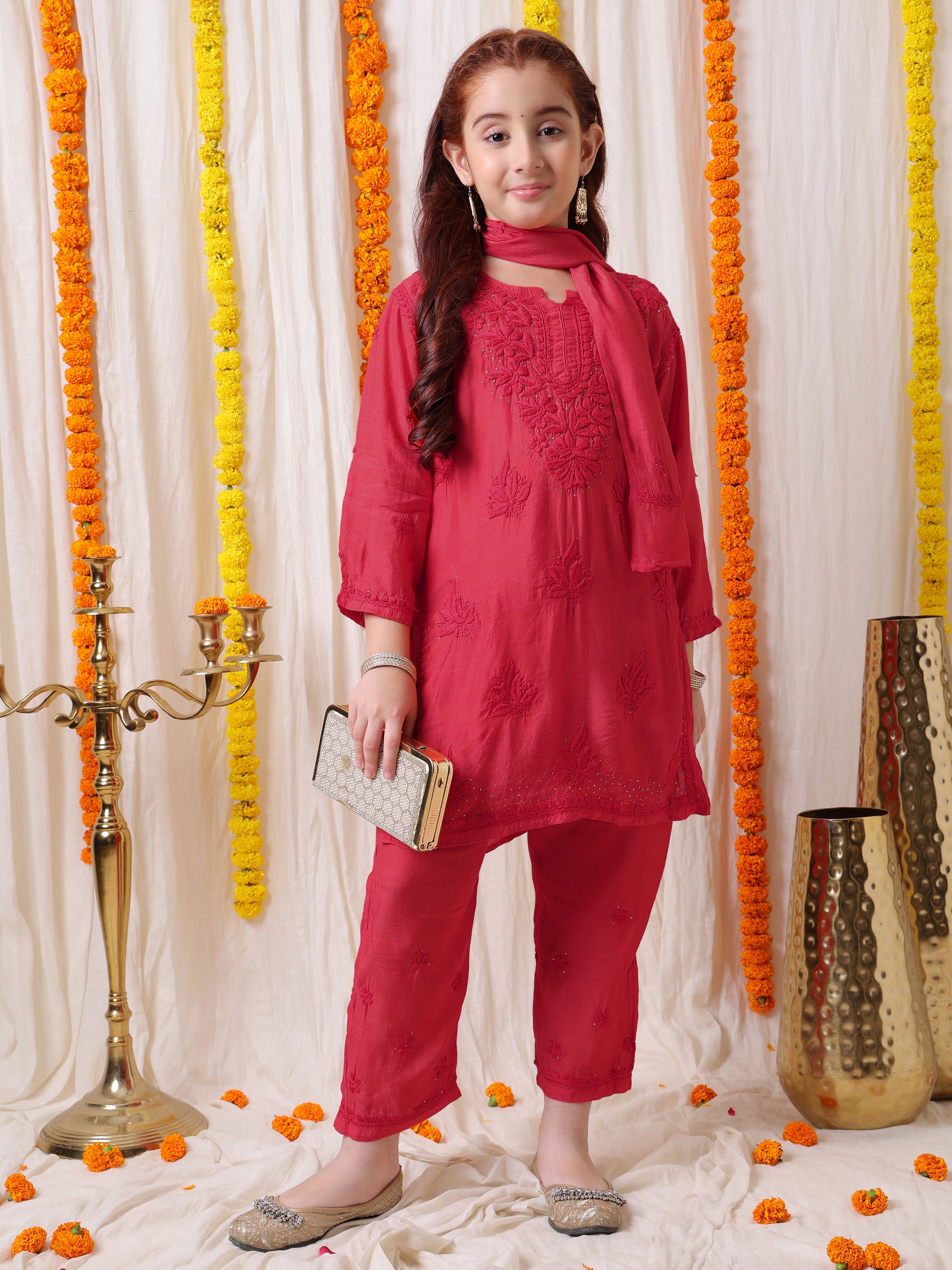 here is our chanderi hand embroidered chikankari kids suit with tiny mukesh detailing all over the pants and dupata too for the first time. the colour is choosen as it promotes emotional healing and tranquility