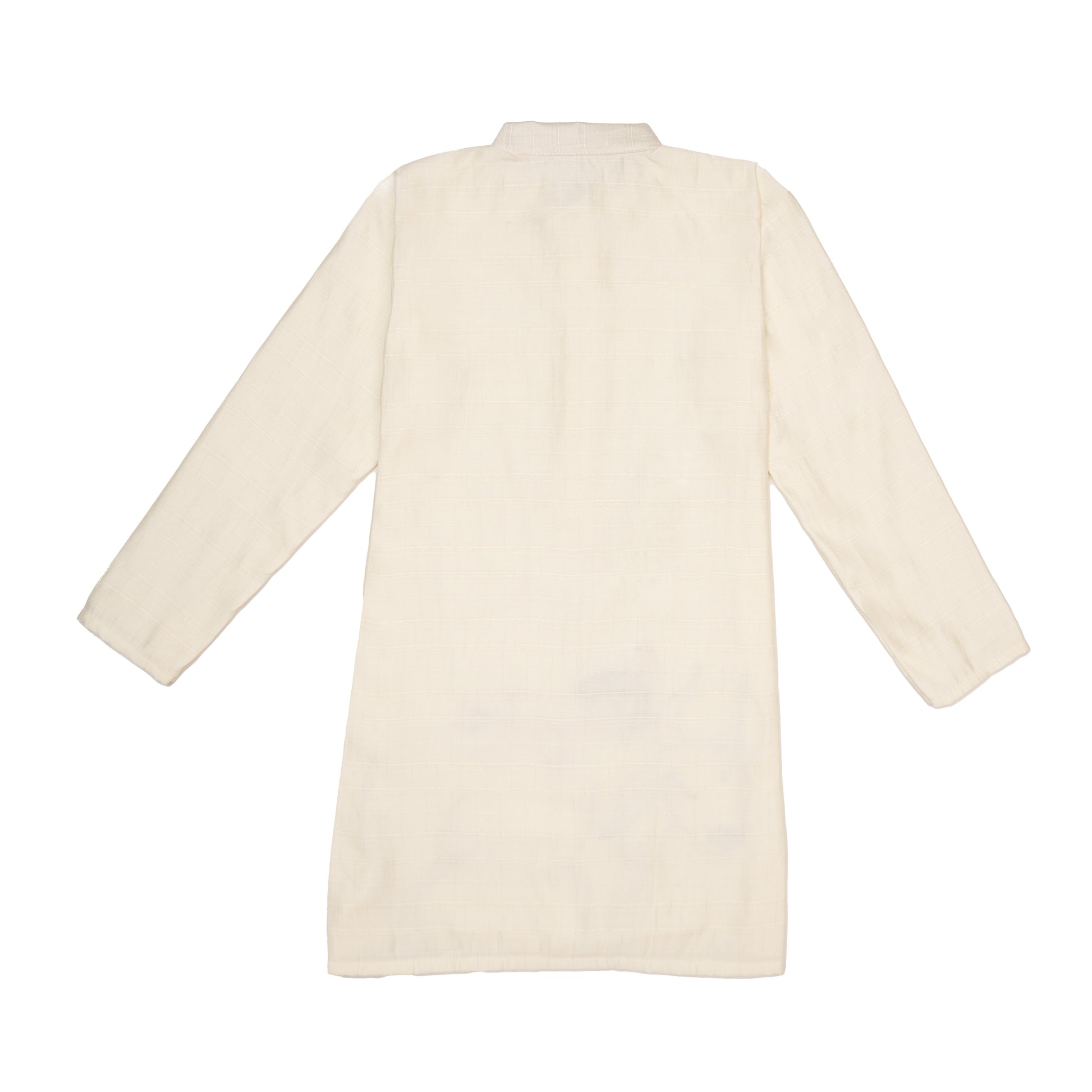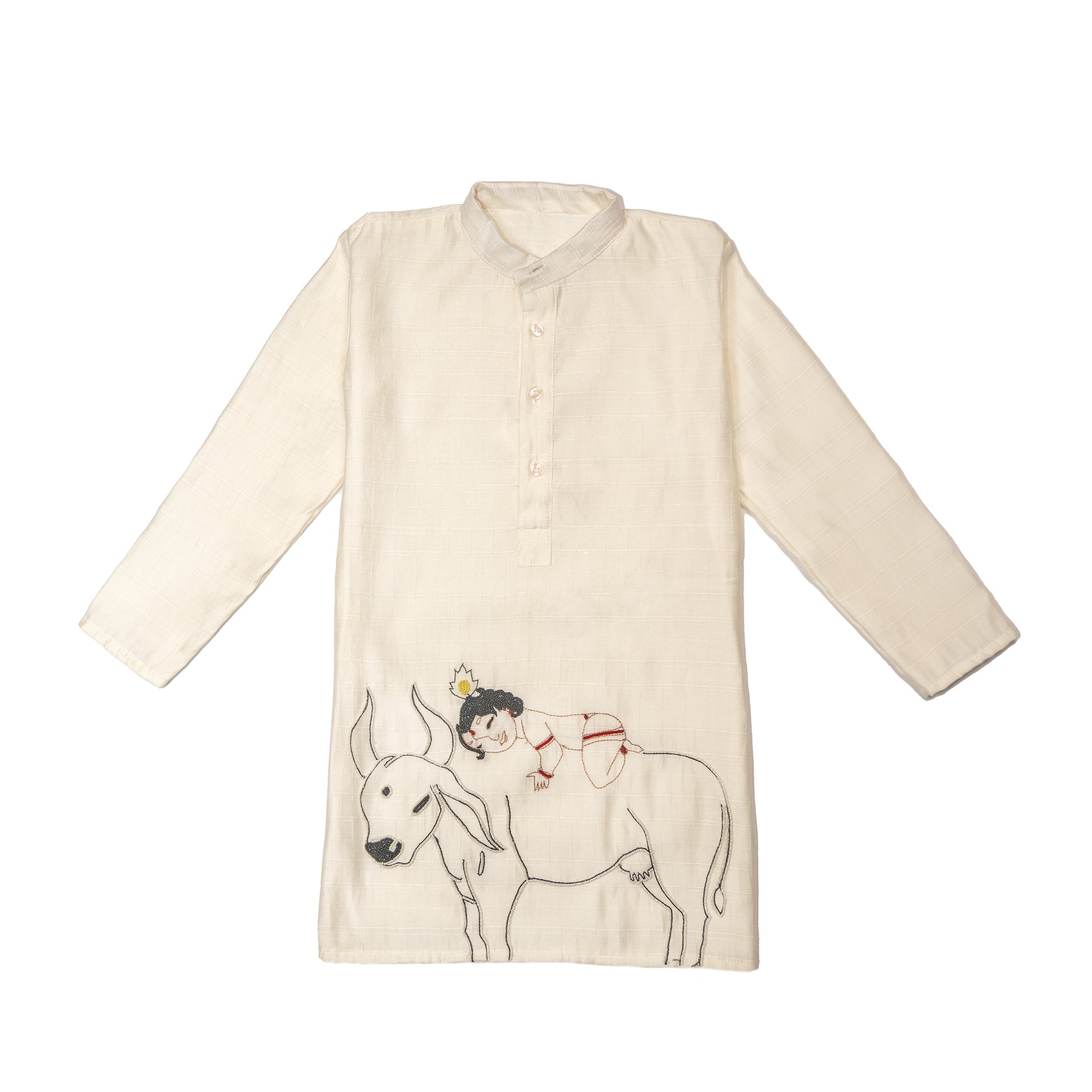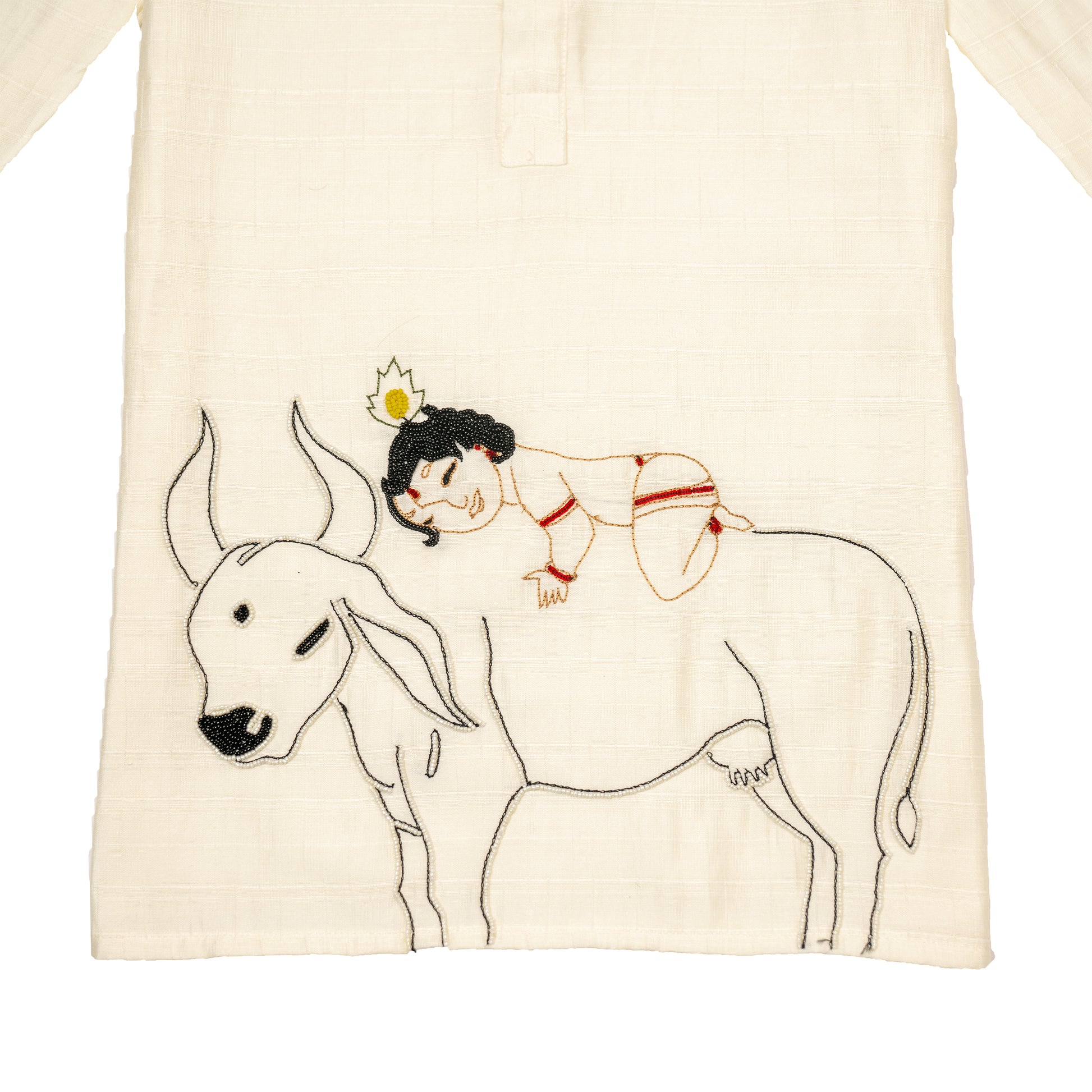 celebrate janmashtami with our gopal’s gau-prem kurta, featuring an adorable hand-embroidered baby krishna resting on a cow. made from soft, breathable fabric, this off-white kurta comes with matching white pants – perfect for festive wear, school events, or temple visits.