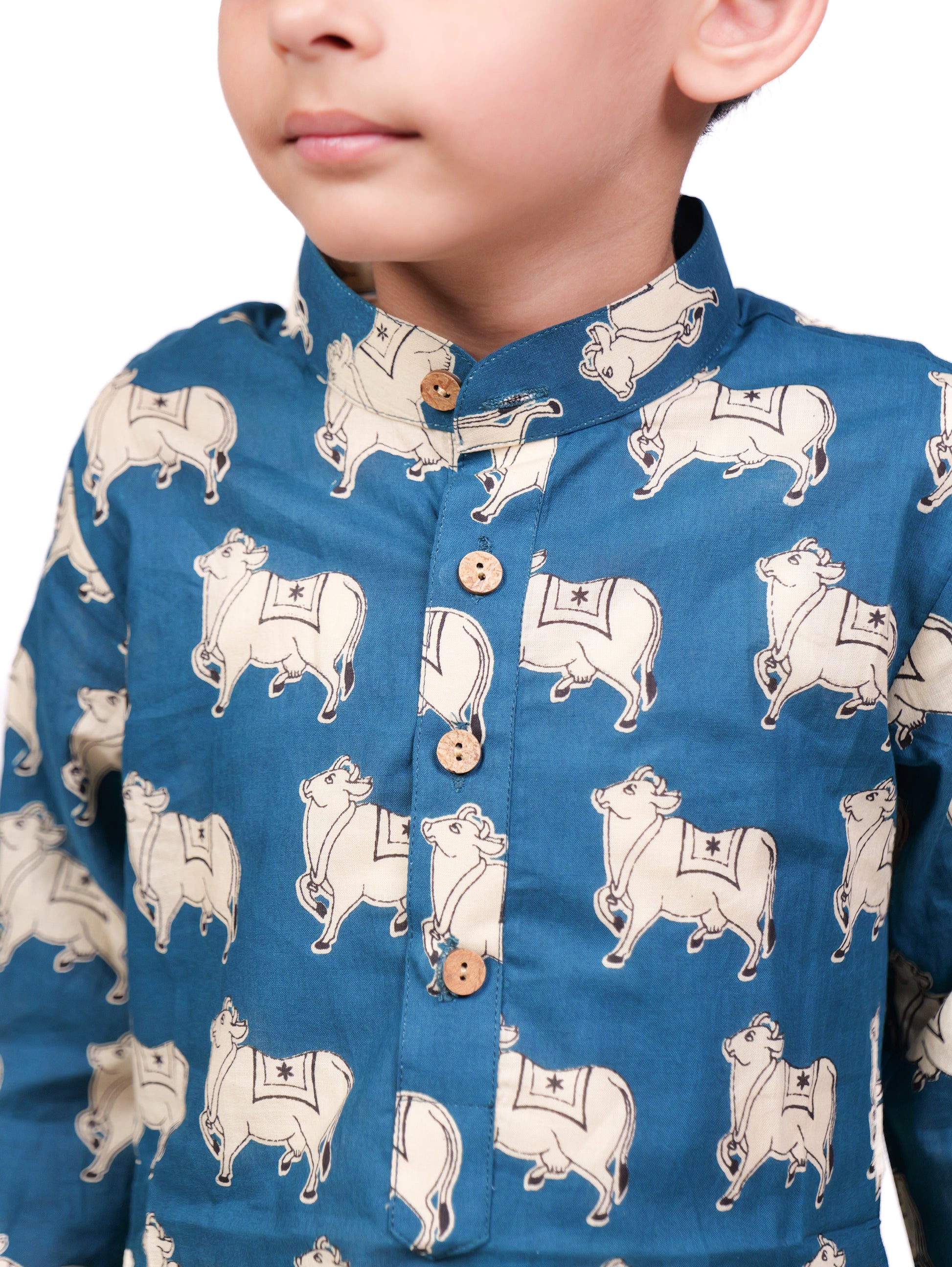 let your little one celebrate in comfort and style with this 2-piece jaipuri cotton kurta pajama set. crafted from ultra-soft breathable cotton, this blue kurta features charming nandini cow block prints, paired with classic white cotton pants for a balanced, elegant look.