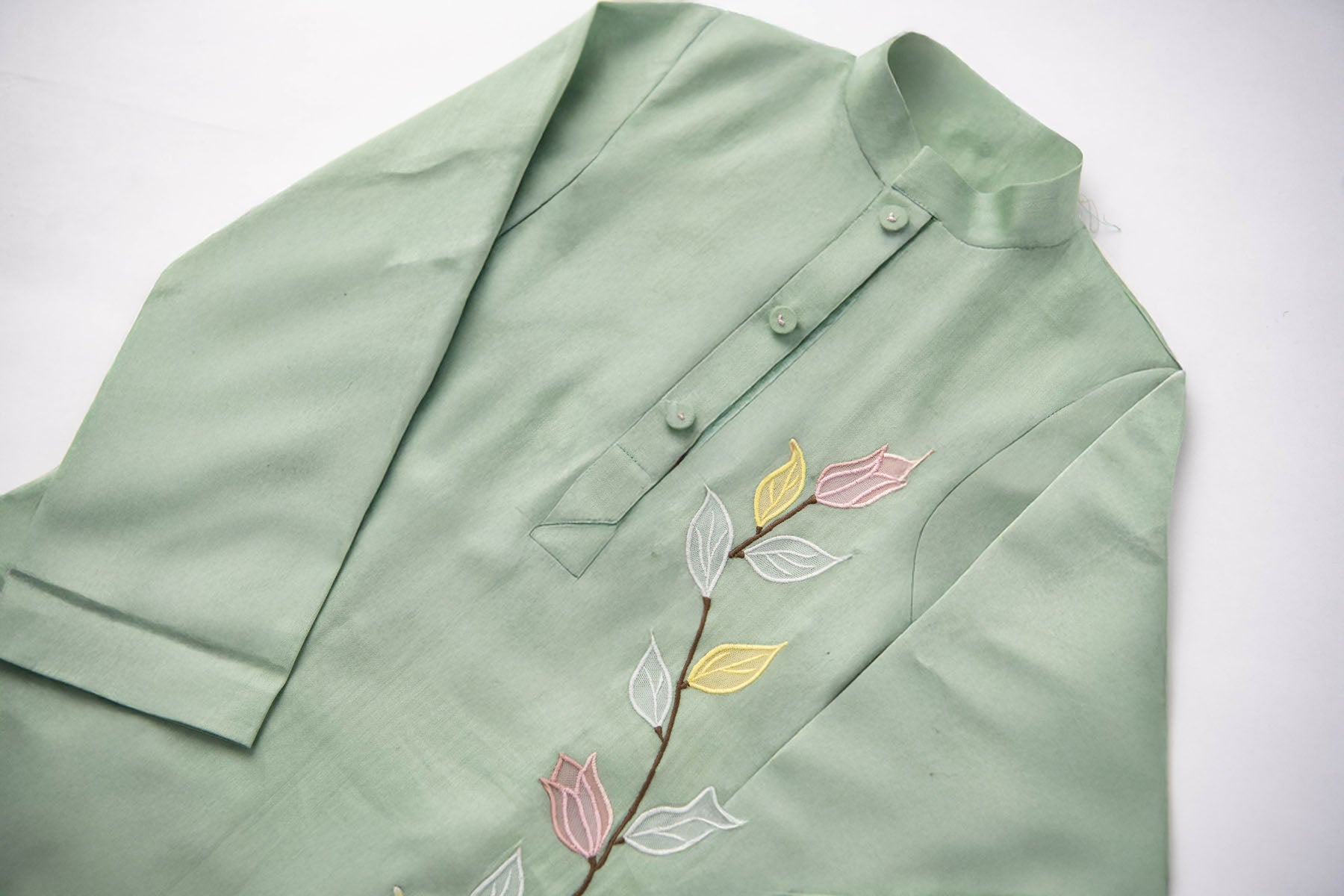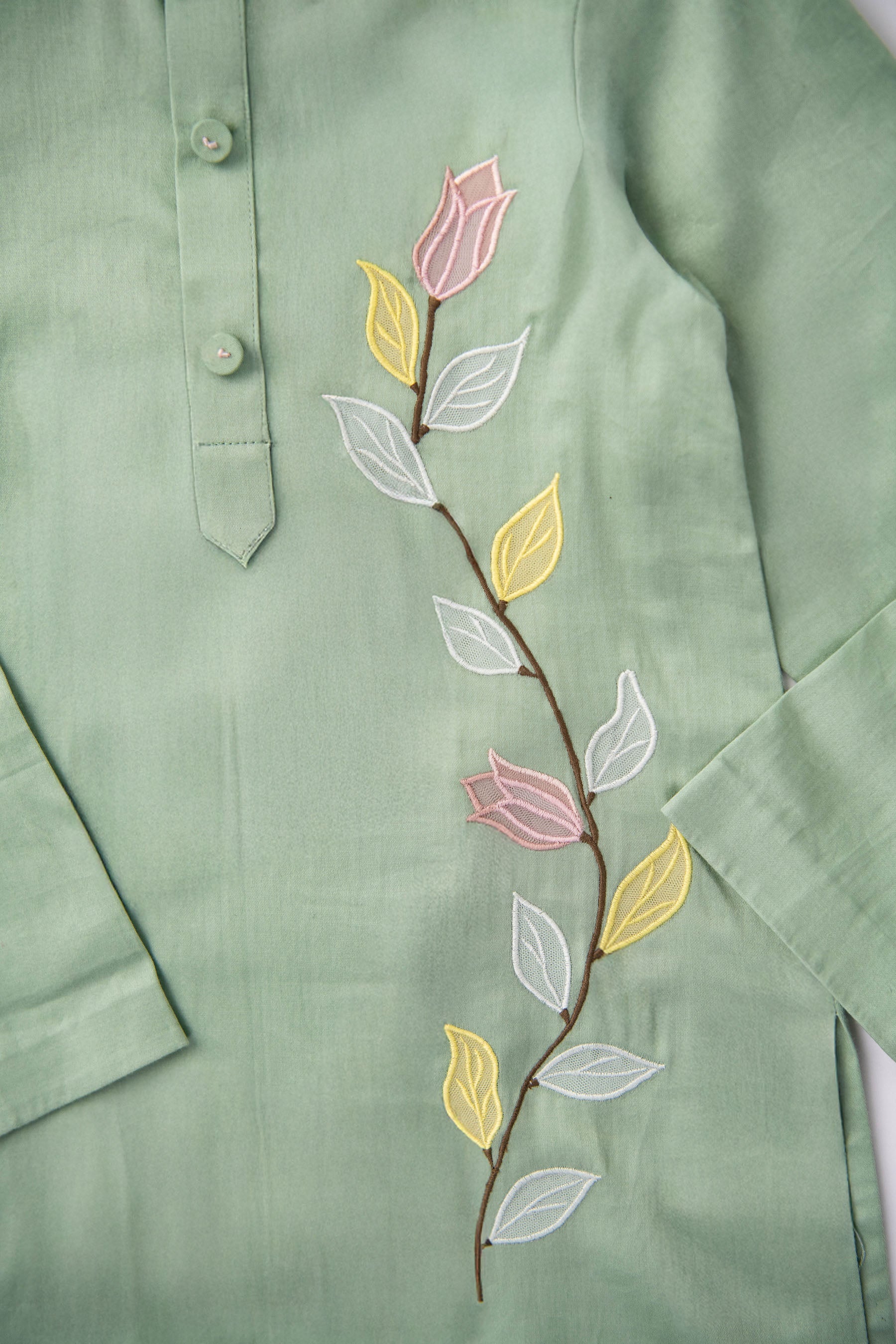 thoughtfully tailored for your little gentleman, the petal prince set is all about understated celebration wear. made in soft, breathable 100% cotton satin, this elegant pastel pistachio green kurta set features clean lines and a charming hand-embroidered floral vine in delicate tones of rose pink, yellow, and ivory – blooming gracefully across one side. the kurta is designed with a classic mandarin collar, handmade buttons, and a relaxed straight fit to ensure ease and style. paired with matching cotton satin straight pants, this two-piece set is ideal for festive moments like rakhi and diwali, bringing together thoughtful craftsmanship and timeless charm — the the right cut way.