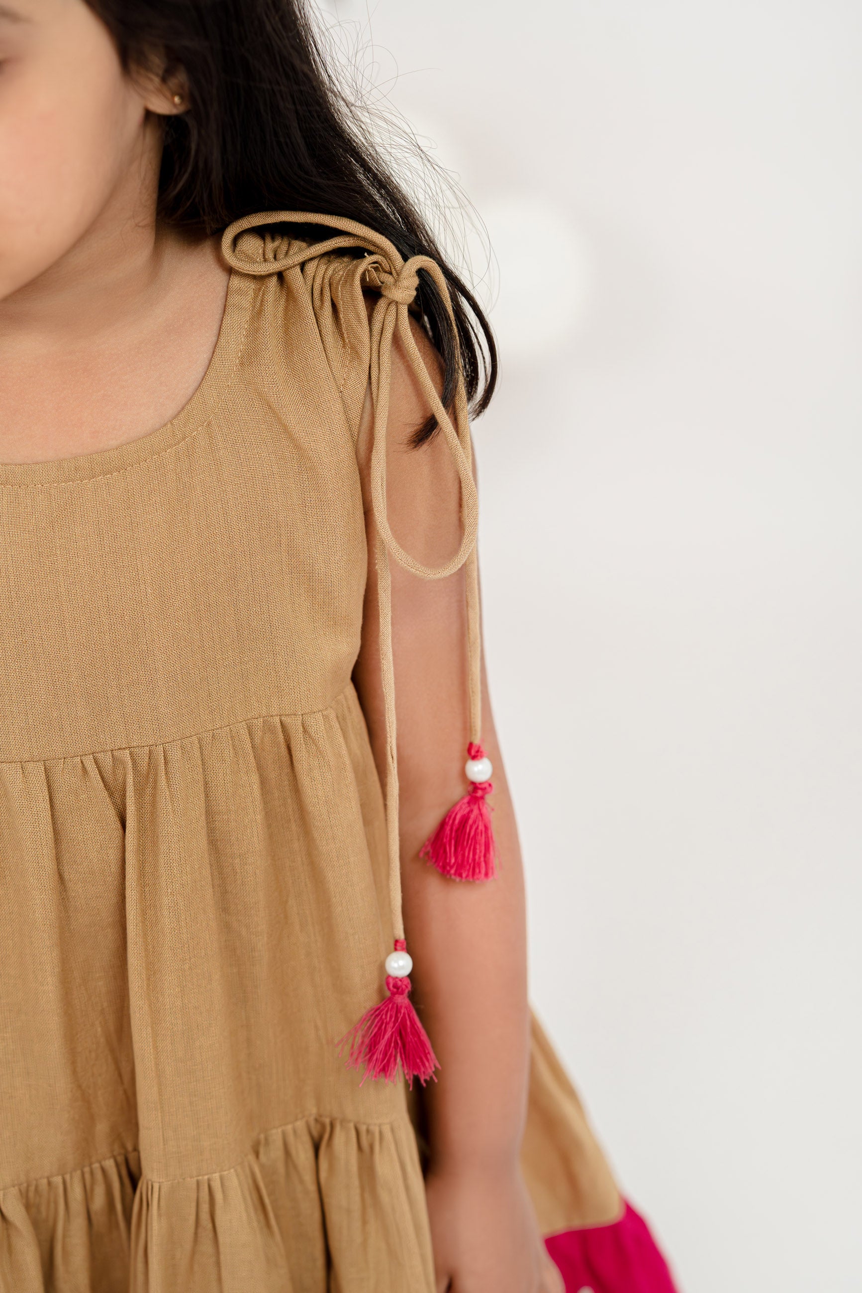 let your little one twirl in style with our tassel twirl beige dress. crafted from soft, breathable fabric, this sleeveless tiered dress features a beautiful beige base accented with a vibrant pink tier for a fun pop of color. the delicate shoulder tie-ups are finished with playful pink tassels and pearl beads, adding a touch of charm and whimsy. perfect for sunny days, special occasions, or casual outings, this dress combines comfort and cuteness effortlessly. pair it with ballerinas or sneakers for a complete adorable look!