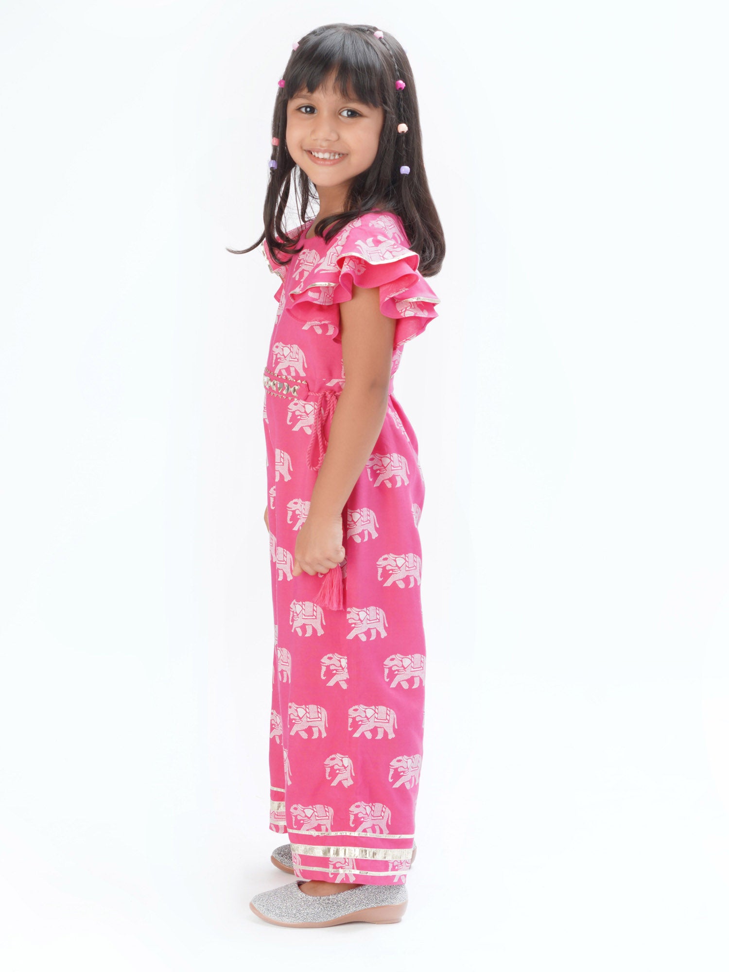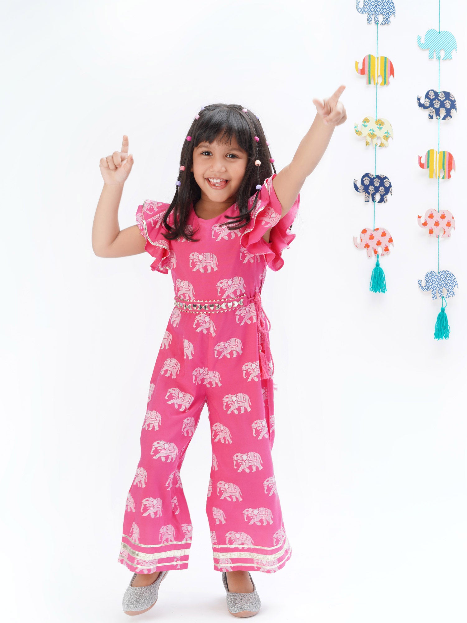 lil drama trunk tales elepant print kurta with net embroidery lace on sleeve and compfy pants:- pink
