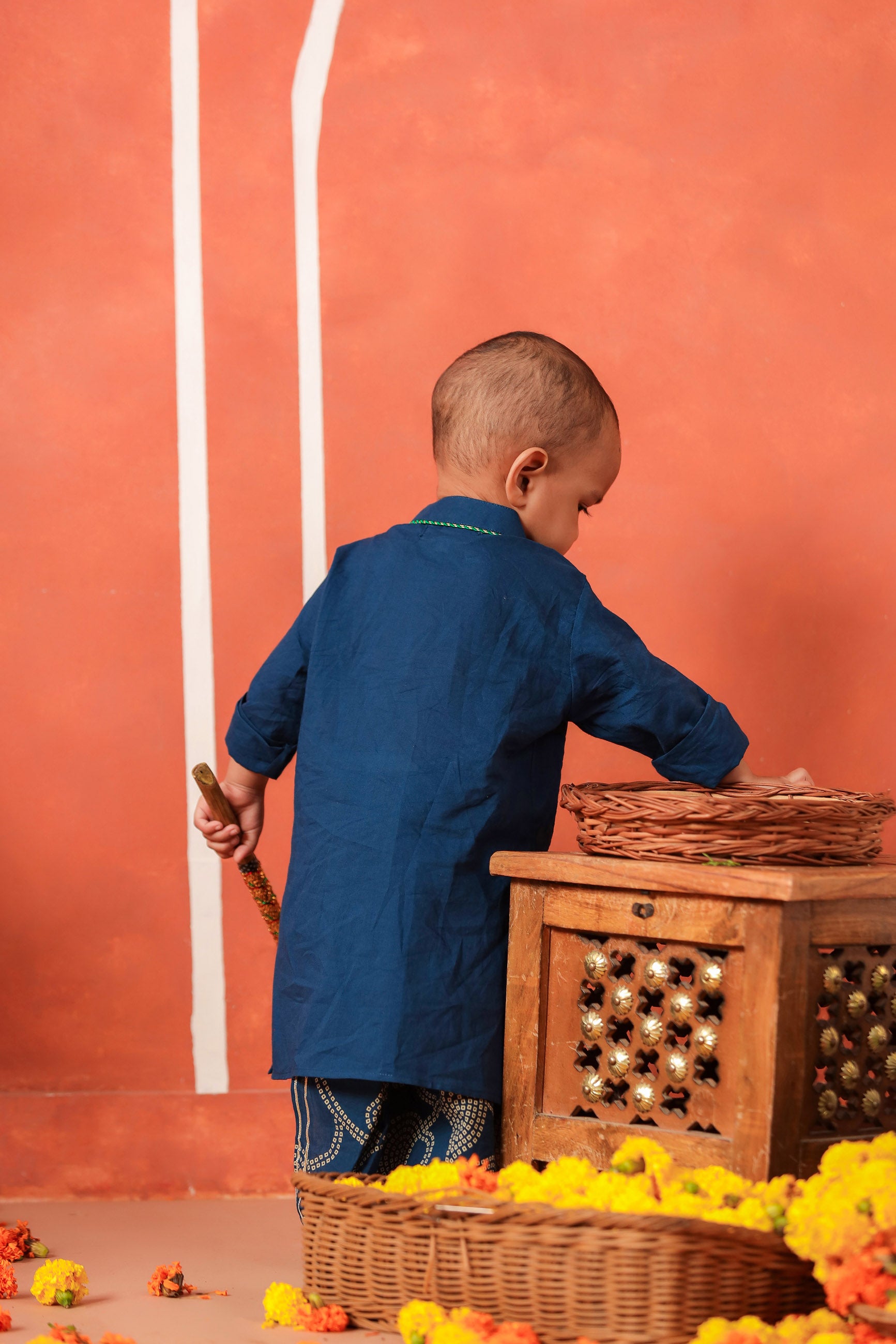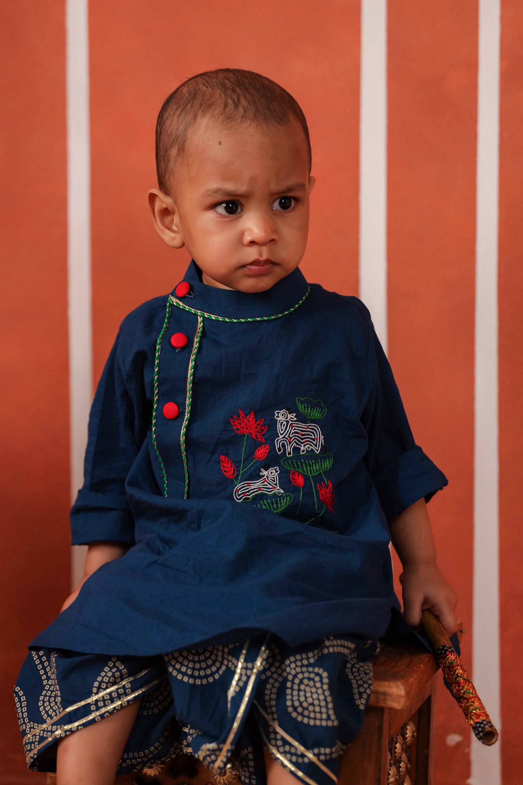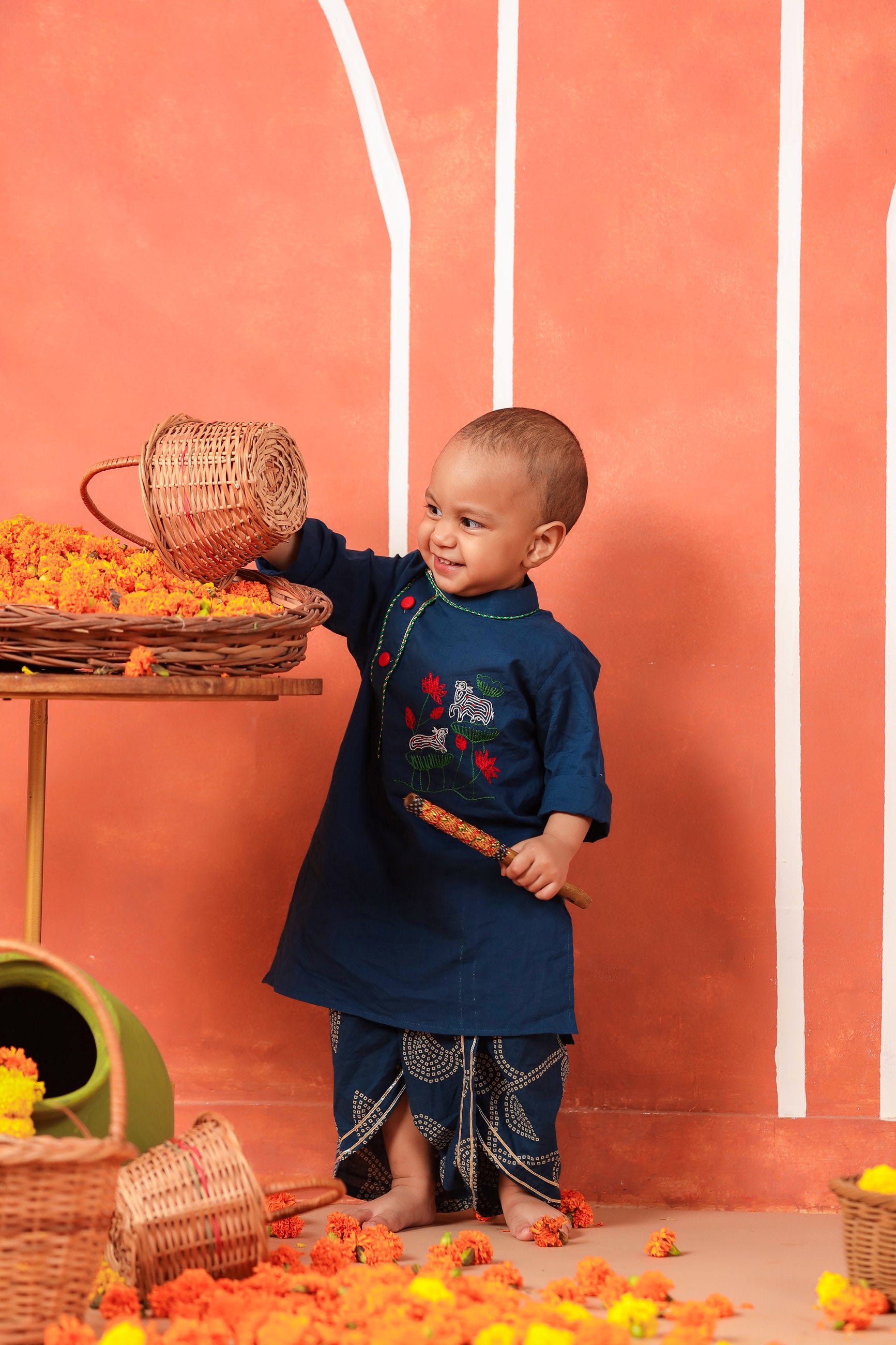 let you kanha embrace his beauty in this royal and classy evergreen set for all occasions. the simplicity and comfort of simple kurta with a stylish side placket of bandhani print and hand embroidered motifs accompanied by dhoti makes it a must have set . 2pc set : 1kurta , 1 dhoti cotton flared dhoti with elasticated waist for best fit and cotton kurta has side front top buttons